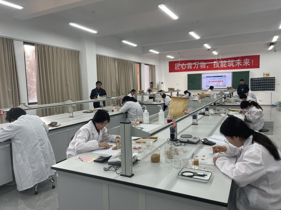 种子质量检验赛项中,选手熟练运用四分法进行净度检验,精准完成千粒重测定与红墨水法种子生活力检测,操作流程规范,数据计算准确。