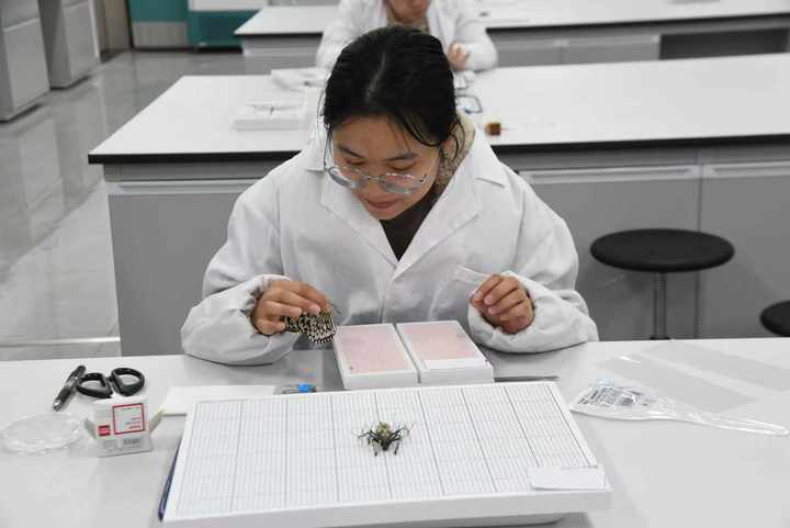 植保病虫害防治赛场,选手们在规定时间内完成病虫害识别,并规范开展昆虫标本整姿、展翅制作,每一步操作均严谨细致,彰显专业态度。
