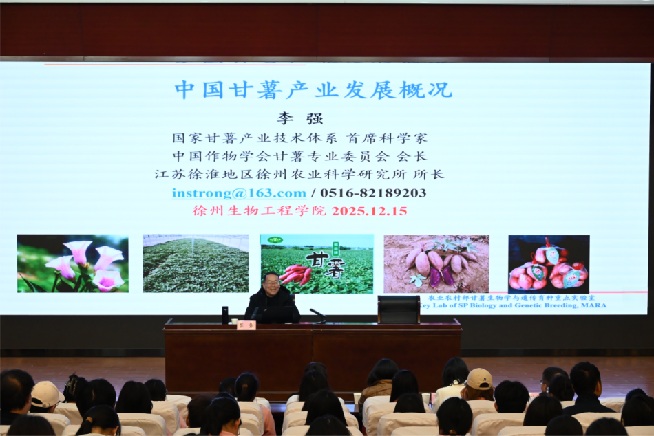 李教授以《中国甘薯产业发展概况》为题,为在场师生带来了一场兼具学术高度、产业深度与人文温度的高水平报告。他从甘薯的起源与全球传播历程讲起,以生动的历史脉络揭示了这一作物在人类农业文明中的重要地位,随后系统分析了我国甘薯产业的现状与独特优势,用翔实的数据和案例阐明了我国在甘薯育种、栽培及产业化方面的实力与潜力;报告最后前瞻性地剖析了中国甘薯产业未来发展趋势与面临的挑战,提出了科技赋能、产业升级、绿色发展等战略思考。整场报告内容充实、语言生动,不仅展现了李教授深厚的学术造诣和丰富的实践经验,更体现了其扎根大地、服务“三农”的科研情怀与使命担当。他以自身数十年的科研攻关和产业服务经历,生动诠释了爱岗敬业、勇于创新的劳模精神,以及执着专注、精益求精的工匠品质,为全体师生树立了鲜活的学习榜样。